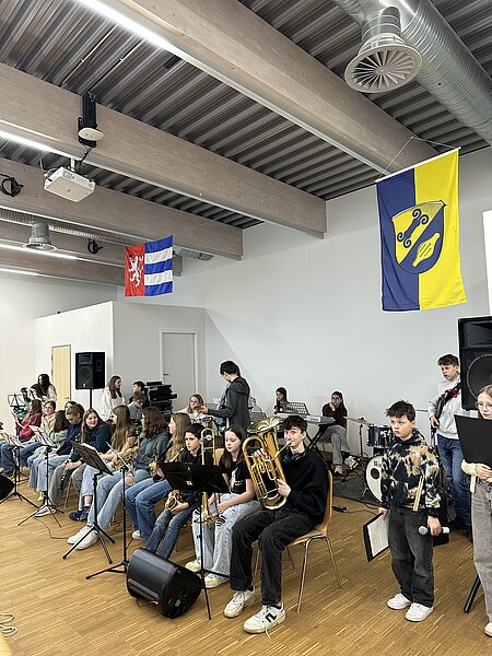 Vor Ort in der Holderbergschule wurde unter der Woche und am Samstag gemeinsam geprobt, für das Abschlusskonzert am Mittwoch, 30. April. Hoher Besuch war aus Tschechien angereist anlässlich dieses Austauschs: der Bürgermeister von Beclov nad Teplu Miroslav Nepraš, mit dem Kastellan des Schlosses Becov nad Teplu und der Chefsektretärin der Gemeinde Becov nad Teplou. Nach den intensiven Proben konnten die jungen deutschen und tschechischen Musikerinnen und Musiker ihr Können vor über 120 Besuchern in der gut gefüllten Aula der Holderbergschule unter Beweis stellen. Die 38 musikalischen Beiträge reichten von Klassik bis zu Rock-Pop. Der sehr verdiente Applaus zum Schluss galt auch dem tschechischen Busfahrer, der zur Überraschung aller Anwesenden spontan auf dem Schlagzeug einen tschechischen Pianisten begleitete.