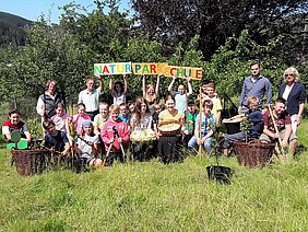 In die eigene Kindheit zurückversetzt, beobachtete er zunächst Fünftklässler, die ausgelassen unter Apfelbäumen Schafen, den „Määhmaschinen“ der Plantage, hinterjagten. Anschließend wurde er von ihnen fachkundig über das Gelände des ehemaligen Obst- und Gartenbauvereins geführt.