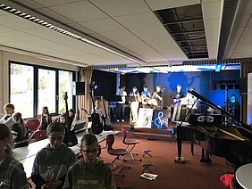 Die "Schule mit Schwerpunkt Musik" wartete mit einer großartigen Show auf: Unter dem Motto „Show the Stars” zeigten die besten Musikklassenschüler der Holderbergschule ihr ganzes musikalisches Können. Mia Stenger und Hendrik Stahl performten auf gekonnte Weise ganz unterschiedliche musikalische Rockmusikstücke aus den 60ern bis 80ern Jahren. Die neu gegründete Bigband der Holderbergschüler besteht nicht nur aus Schülern der Bandklasse, sondern ein 4-stimmiges Bläserensemble sorgt für einen authentischen Bigbandsound. Nicht nur die Schüler der 5. Klassen, die den Grundschülern gerne ihr Instrument näher bringen wollten, sondern auch die Familien der Viertklässler konnten so einen Eindruck von der erstklassigen musikalischen Ausbildung an der Holderbergschule, die mit der Musikschule Wetzlar zusammenarbeitet, gewinnen.