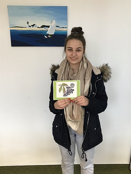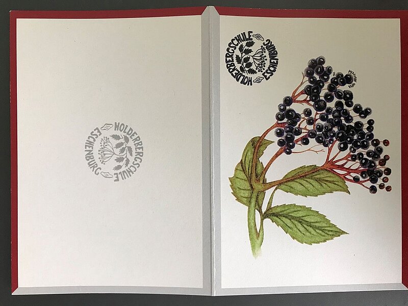 „Holunder! Das ist das passende Motiv für die Grußkarte der Holderbergschule!“ - So freute sich die Schulleiterin Andrea Rink, als Janine Strycker ihr begeistert die Zeichnung von Viola Albrecht (9R3) vorlegte. Für die Verkaufsstände der Naturparkschule setzt Viola regelmäßig ihr künstlerisches Talent ein: Aktuell gestaltet die Realschülerin ein Löwenzahnblütenmotiv. Das Holunderbeermotiv entstand während der Verarbeitung von Holunderblüten und –beeren im letzten Jahr. Für die Erstellung der Grußkarte benötigte Viola 18 Stunden, gemalt wurde mit Buntstiften. Nach der Schule möchte die Neuntklässlerin, die von sich sagt, dass sie zeichnet „seit ich einen Buntstift halten kann“, einen handwerklichen Beruf erlernen, der ihr die Möglichkeit gibt, kreativ zu sein. Die Holderbergschule bedankt sich bei Viola Albrecht für ihren gelungen künsterlischen Einsatz!