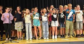 "What a wonderful world" von Louis Armstrong ertönte zum Abschluss des achten English Summer Camps an der Holderbergschule. 46 Schülerinnen und Schüler standen auf der Bühne der kleinen Turnhalle und begleiteten ihren Gesang mit passenden Gesten zum Lied des legendären schwarzen US-Musikers. "What a wonderful world" war auch das Motto des diesjährigen, handlungsorientierten Sprachkurses, an dem Schülerinnen und Schüler aus den angehenden fünften bis siebten Klassen aus der näheren Umgebung teilnahmen – die Mehrheit unter ihnen sind bereits an der Holderbergschule oder starten hier in Klasse 5.