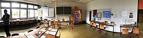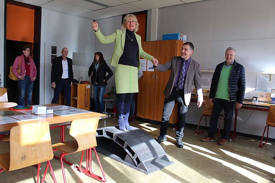 Ab jetzt kann das „ExperiMINTum“, ein Raum mit über 60 Experimenten aus der Mathematik und Physik, von den Schulklassen genutzt werden. Allein oder in Zweierteams werden Experimente durchgeführt, ausgewertet und erklärt. Entsprechende Anleitungen finden sich an jedem Exponat. Die Schulleiterin Frau Rink dankte zur Eröffnung der Deutschen Physikalischen Gesellschaft (dpg) und der Firma Brettauer für die jeweils großzügige finanzielle Unterstützung, ohne die das Projekt nicht möglich gewesen wäre. Anschließend schilderte Giulia Klingelhöfer aus der 8G1, wie ihre Klasse zusammen mit ihrem Klassenlehrer die Mathematikexperimente aus dem ehemaligem Mathematikum umgeräumt und zusätzlich 25 Physikexperimente neu entworfen und aufgebaut hat. Für diese fertigten die Achtklässler sowohl Durchführungsanleitungen als auch Lösungen an. Die Lösungsmappe lag bei der Eröffnung zur Einsicht offen, ist sonst aber nur für die Lehrkräfte einzusehen.