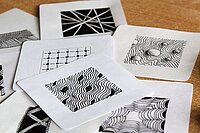 Wie kann man mit schwarzem Stift und Papier ausgerüstet, kleine Kunstwerke zaubern? Im Wahlpflicht-Kurs von Sebastian Paschal sind 18 Siebtklässler in den ersten Wochen des Schuljahres in die Technik des Zeichnens von „Zentangles“ eingeführt worden. („Zen“: Zur Ruhe kommen und „tangle“: Gewirr). Auf weißem Papier und im „Kachelformat“ können die Haupt- und Realschüler freie Zeichnungen aus Formen mit wiederkehrenden, nicht vorgegebenen Mustern anfertigen. „Hierzu ist nur wenig Material notwendig“, so Sebastian Paschal. „Zwei schwarze Fineliner mit unterschiedlicher Strichbreite, ein Bleistift und ein Verwischer, mit dem spezielle Effekte erzielt werden können.“